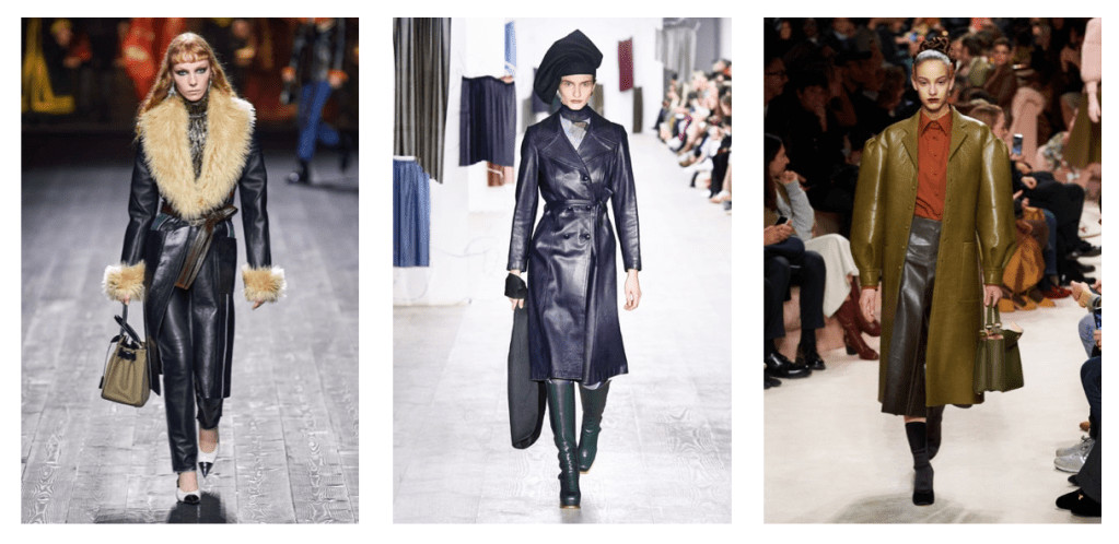Leather should be a key item in everyones winter wardrobe and this year is no different. This year leather jackets have been transformed into gorgeous longline leather coats. Even though trench coats were the most common style they weren’t the only style if you want to mix it up. Louis Vuitton nailed the mixed textures look with a bold fur collar and fur cuffs to elevate a leather coat. Richard Malone kept it simple but effective with a stunning Navy leather trench coat. And Fendi added a fun twist with the puff sleeve detail and the vibrant khaki colour. Again, there is something for everyone and every outfit!