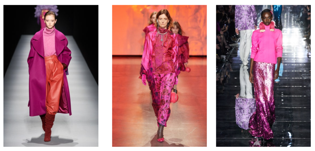 Another very common colour that appeared all over the fall 2020 runaway was pink and a very bright pink at that but gorgeous nonetheless! A mix of magentas, fuchsias and hot pinks will replace the pastel baby pinks of the summer and I am here for it. It may seem bold but is definitely more wearable than it may appear. Whether you want to go all out with a monochrome look or pair it with blue denim for a more causal day time look or even just have a pop of colour in an accessory, I promise you there is a space in your wardrobe for this lush colour. As shown in the runaway photos the colour will be available in all types of clothing from coats to sequin skirts so there will be plenty of choice.